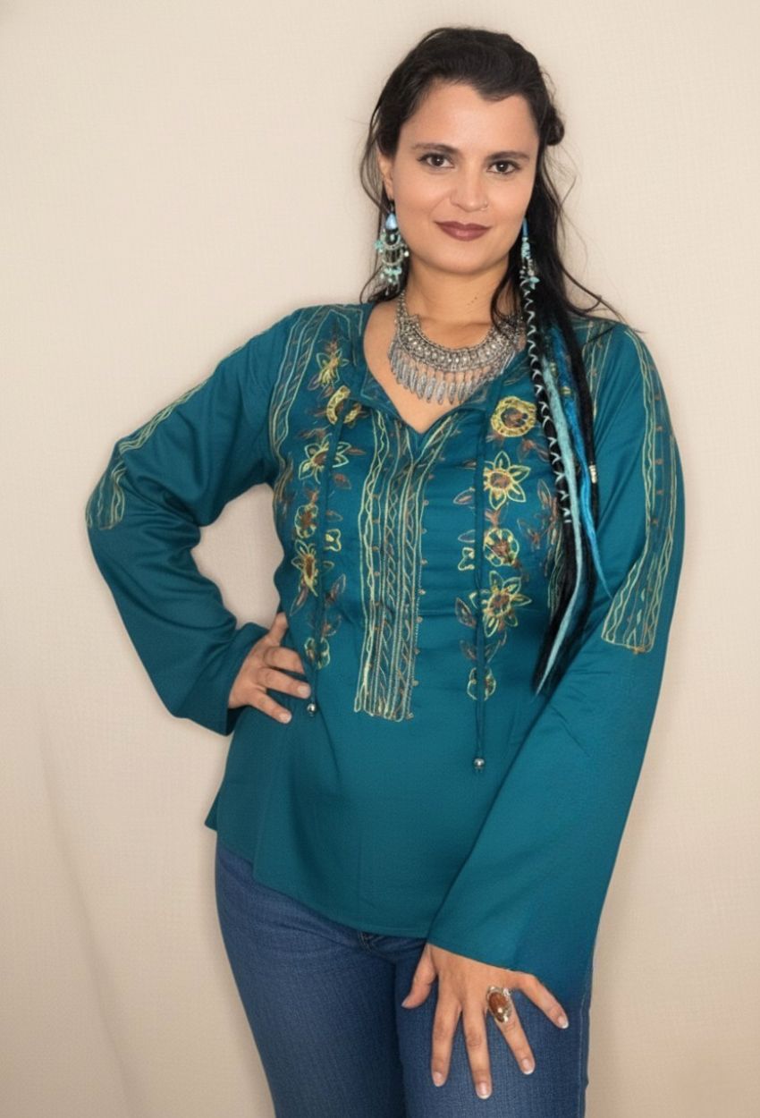 Com caimento soltinho e mangas retas, é uma peça versátil que combina com todas as fases do seu dia. Use com rasteirinha e shorts para um look natural e livre, combine com bota e calça para um visual boho marcante ou aposte em um salto para noites especiais — a bata se adapta ao seu momento e traduz o seu espírito livre.