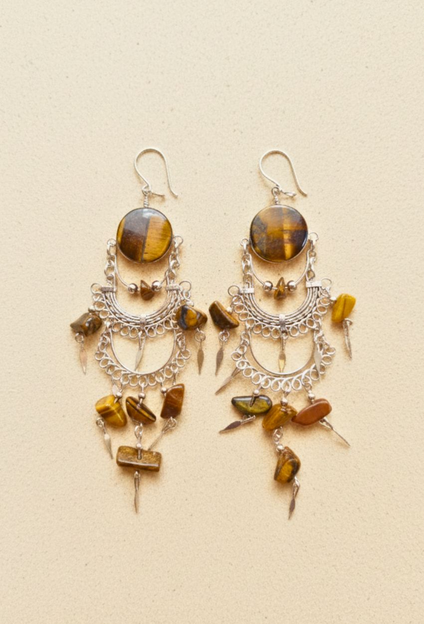Liberte seu estilo com o Brinco Hippie de Alpaca e Olho de Tigre, uma joia artesanal que captura a essência da alma livre. Perfeito para compor um visual boho autêntico, este acessório é a peça-chave que faltava na sua coleção.