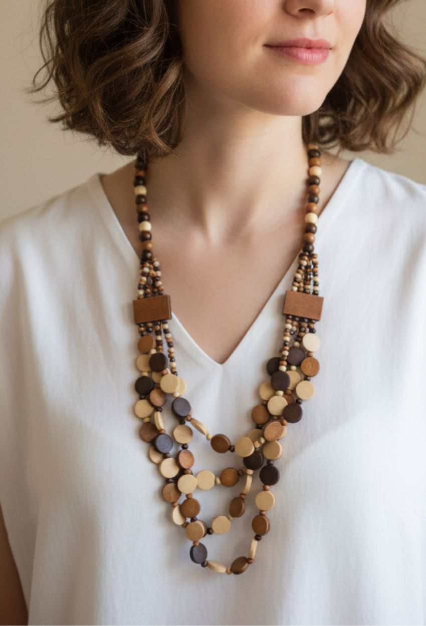 Com um design impactante de múltiplas camadas, o colar apresenta contas e discos de madeira natural em diversos tons terrosos – do bege suave ao marrom profundo. Cada elemento foi cuidadosamente selecionado para criar um visual orgânico e textural, lembrando os caminhos sinuosos do fundo do mar ou as trilhas costeiras que levam à praia.
