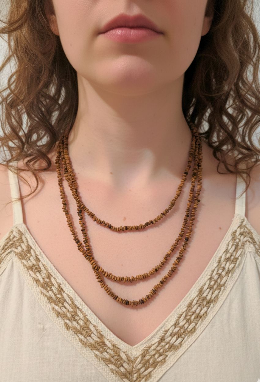 Com seus tons terrosos e neutros, o colar é super versátil e combina com diversas cores, tecidos e estilos — do boho chic ao casual praiano.