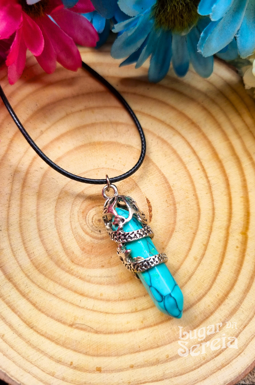 Aquele colar clássico que encontramos nas barraquinhas hippies das praias, mas com o pingente um pouco diferenciado. Além da pedra em formato de ponta, a peça está envolvida por um dragão na cor prateada.